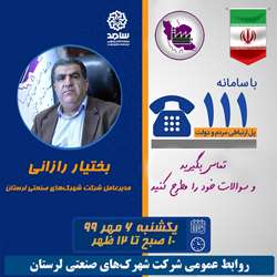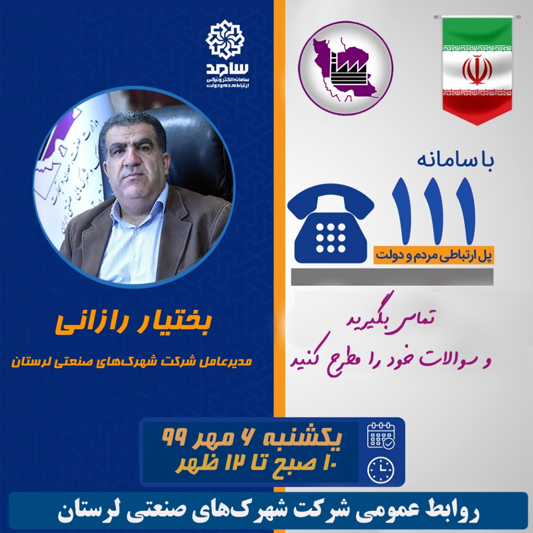 روابط عمومی شرکت شهرکهای صنعتی لرستان از عموم مردم به ویژه صنعتگران و فعالان اقتصادی تقاضا دارد، از ساعت 10 صبح تا 12 ظهرروز یکشنبه 6 مهر ماه 99، در تماس با شماره تلفن 111 «سامانه سامد استانداری لرستان» سوالات خود را مطرح کرده و پاسخ کارشناسی مقتضی را دریافت کنند.